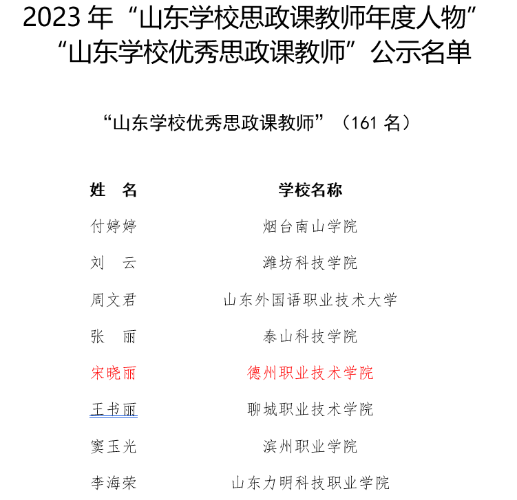 近日,山东省教育厅对2023年度“山东学校思政课教师年度人物”和“山东高校辅导员年度人物”评选结果进行公示。我校马克思主义学院教师宋晓丽荣获“山东学校优秀思政课教师”称号。