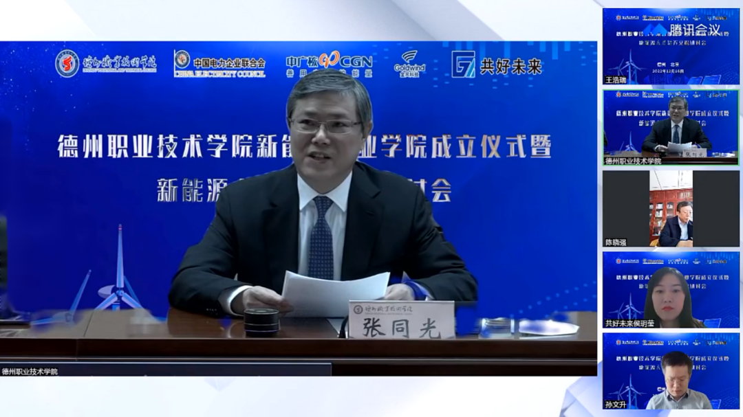 12月16日,德州职业技术学院携手中国电力企业联合会、中广核新能源控股有限公司、新疆金风科技集团、共好未来(北京)教育科技有限公司共聚云端,举行“新能源产业学院”揭牌成立仪式。教育部、国家发改委、山东省教育厅等相关负责同志,德州市副市长陈晓强到会讲话,电力行指委、高校毕业生就业协会、国网综能服务集团有关领导、专家等1000余人参与本次活动。德州职业技术学院党委书记樊兆杰主持线上会议。