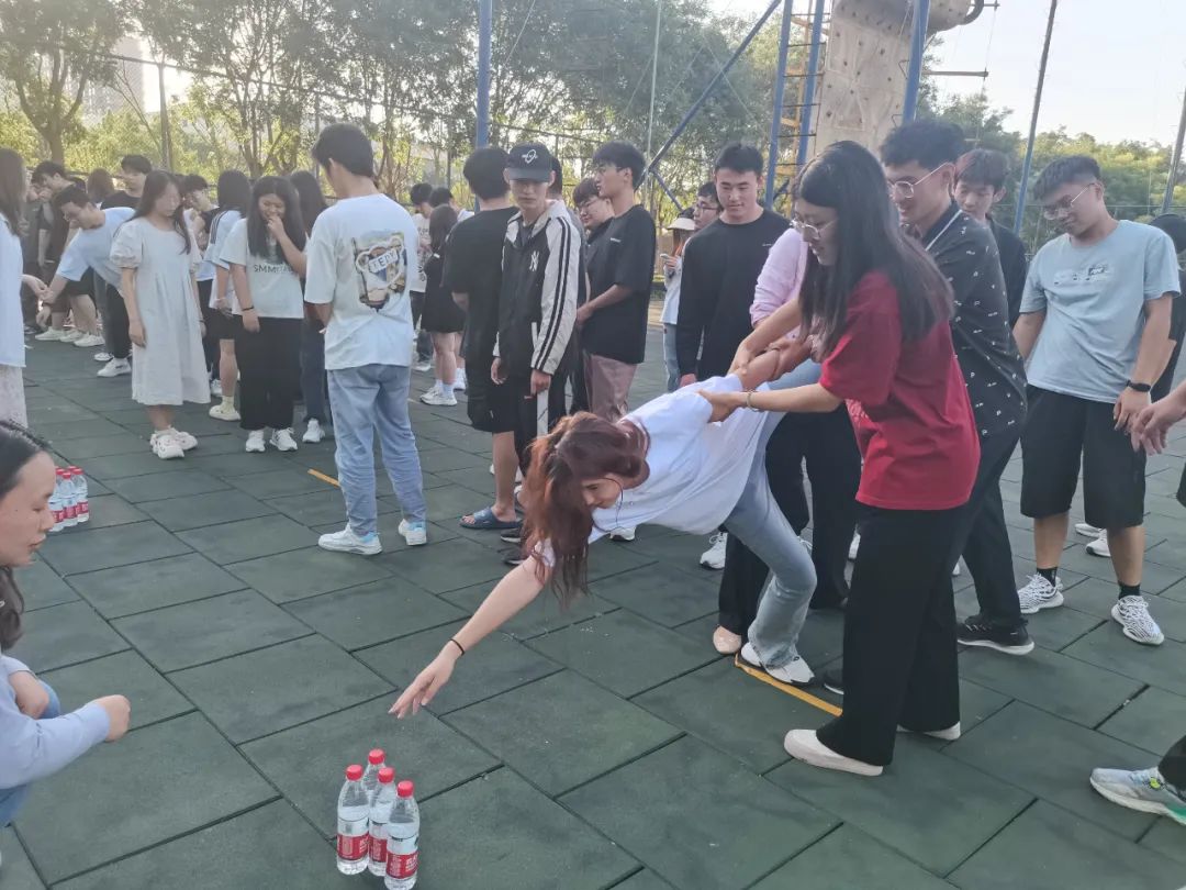 在随后紧张有序的游戏环节中,同学们像石榴籽一样紧紧团结在一起,共同突破一项项挑战。在疾风劲草游戏中,大家挑战自我安全区,建立对团队成员的信任,感受这种信任带来的个人突破。在群龙取水游戏中,团队成员密切沟通配合,确保“水源”能够顺利流向“干旱”地区,体会全体成员同心协力共同共克时艰的决心与信心。通过参与一系列游戏,同学们彼此磨合、积极思考、认识自我、探索自我,在轻松融洽、相互信赖的团队中逐渐成长。